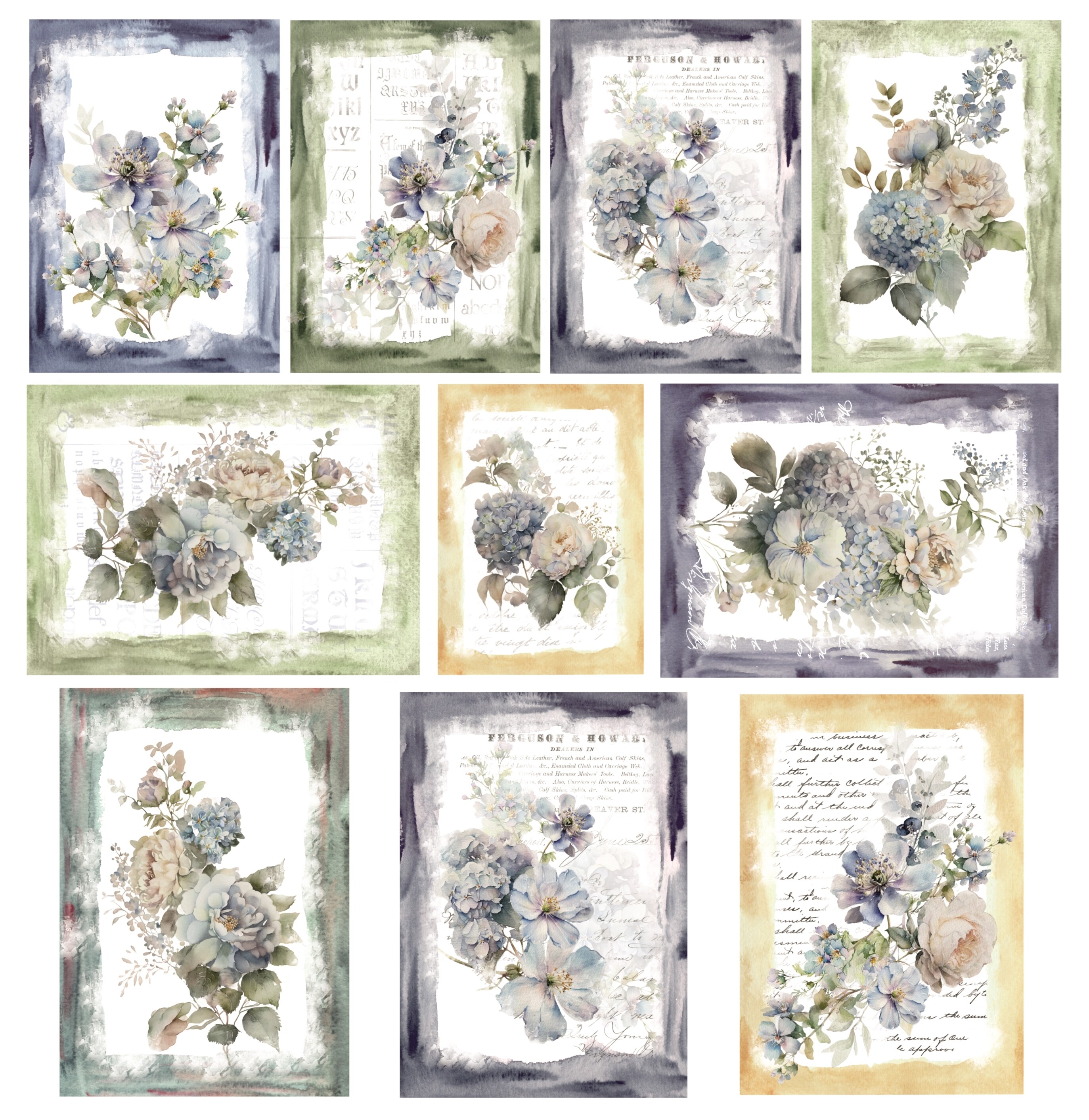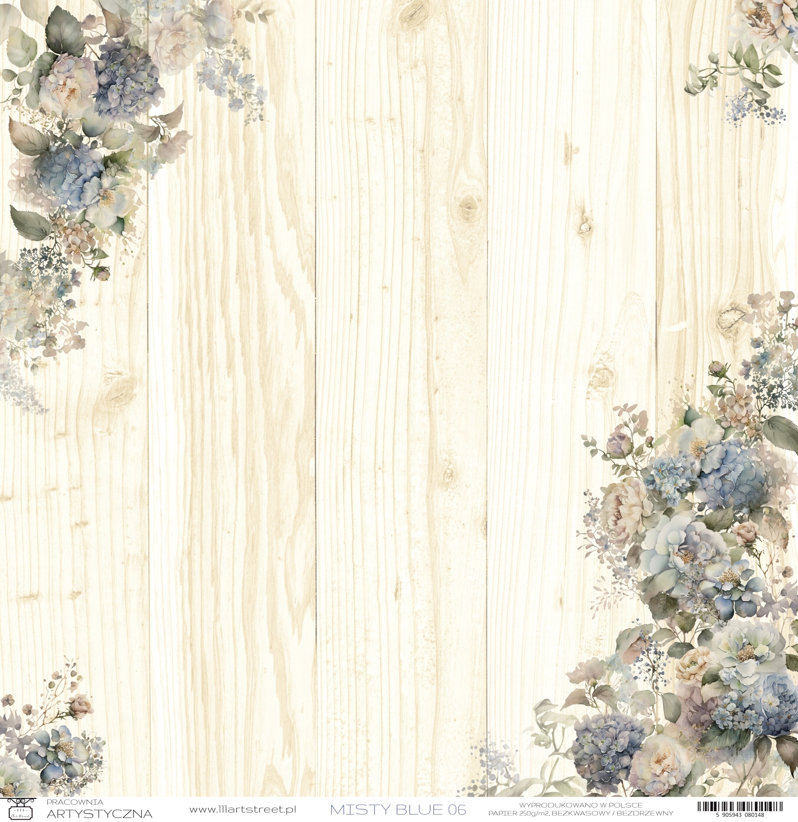 Kolekcja kwiatowa z elementami drewna, w odcieniach jasnego beżu i mglistego błękitu.